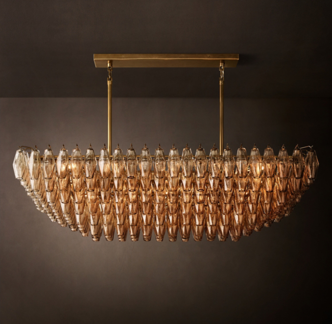 Paying homage to Murano glass chandeliers of 1950s Italy, our fixture celebrates the period's minimalist spirit in a grand manner. Radiating from a tiered steel frame, dozens of handblown glass polyhedrons hang from individual hooks. Lit from within, the faceted pendants dramatically reflect and refract the light.
