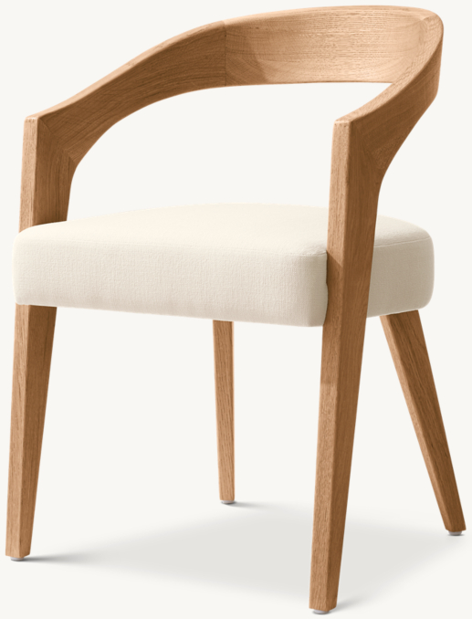 The Chloé chair evokes the streamlined sensibility of midcentury design. Handcrafted of solid oak, the ribbon-like contoured backrest flows into tapered legs, its curves complemented by crisp, geometric lines. The sculptural frame supports a generously padded seat.
